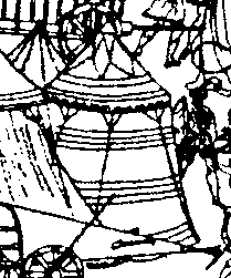 Of all the bracing structures, the ring is probably the simplest, lightest, and easiest to set up. That's why Dragonwing uses it for our round pavilions, although I make no claim for authenticity. I have also seen various kinds of spoke-based designs, either radiating out from the center pole or using a "wagon wheel" affair sitting on lots of side poles, with a false centerpole protruding from the wheel's axle and supporting the canopy peak. There doesn't seem to be any documentation for any of these designs, only a sentiment that they would have been within the technology of the period and would have been logical outgrowths of that technology.