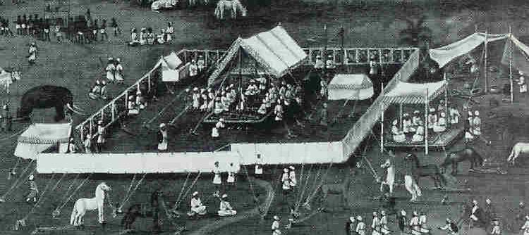 Note also that the tent doesn't use guy ropes, either. Instead, it's draped over cross-poles supported by vertical posts that seem to be embedded in the ground. The closest I can come to a canopy roughly like the BC style that's supported by guys comes in a picture of the Duch East India Company's settlement on the Ganges in Bengal: