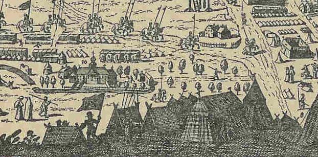 It's an engraving from Strada's "De Bello Belgico" (1651 Edition). Note the date, because that puts the picture out of our period of study.The question is: was the engraver working from another sketch, made after the battle, or was he drawing what he figured an encampment of that period would look like? We don't know, and therefore this engraving can't be considered documentation for the kind of tent we see around the SCA. At most, it can be said that the artist would have considered that sort of tent appropriate to that particular era.