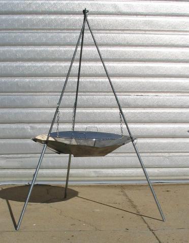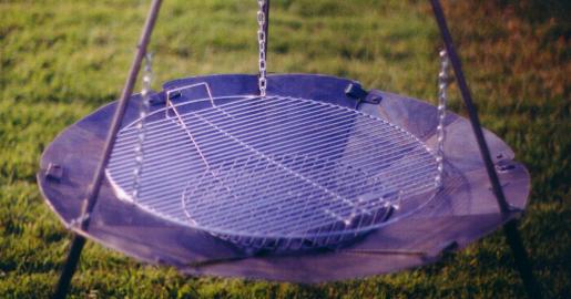The cooking grill is 21-1/2" in diameter -- the same size as the standard kettle-type grills. Its height can be adjusted from three inches over the coal grate (which would be about two inches from the top of the coals) to ten inches, to accomodate a wide variety of temperatures. Unlike most of the firepits made on Flieg's design, this one suspends the grill on short segments of chain attached to hooks set only eleven inches above the lip of the bowl, rather than long chains attached to hooks near the apex of the tripod. This configuration keeps the chain cooler, allowing a greater degree of comfort when adjusting the height of the grille. It also saves you the trouble of having to wrap the chain around the legs of the tripod to keep the grill from swinging excessively. We've used this configuration on our own firepit for over five years and believe it to be a great improvement on the original.