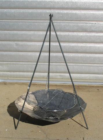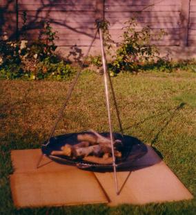 Now drop the coal grate onto the bowl. It provides a little draft under the coals to keep them burning and also keeps the bottom of the firepit bowl a little cooler. At this point, you can build a fire in the firepit and enjoy a bardic session. Or if you want to cook, you can hang the grill onto the tripod using the chain and hooks. The height of the grill is adjusted by using more or fewer of the links on each segment of chain. You have about seven inches of adjustment, more than you'll probably ever need. Once the cooking is over, the grate is easily removed so a conventional campfire can be built in the bowl. The ring at the apex of the tripod is large and strong enough to accomodate a pot hook, so that cooking pots can be suspended over the fire instead of being placed on the grill.