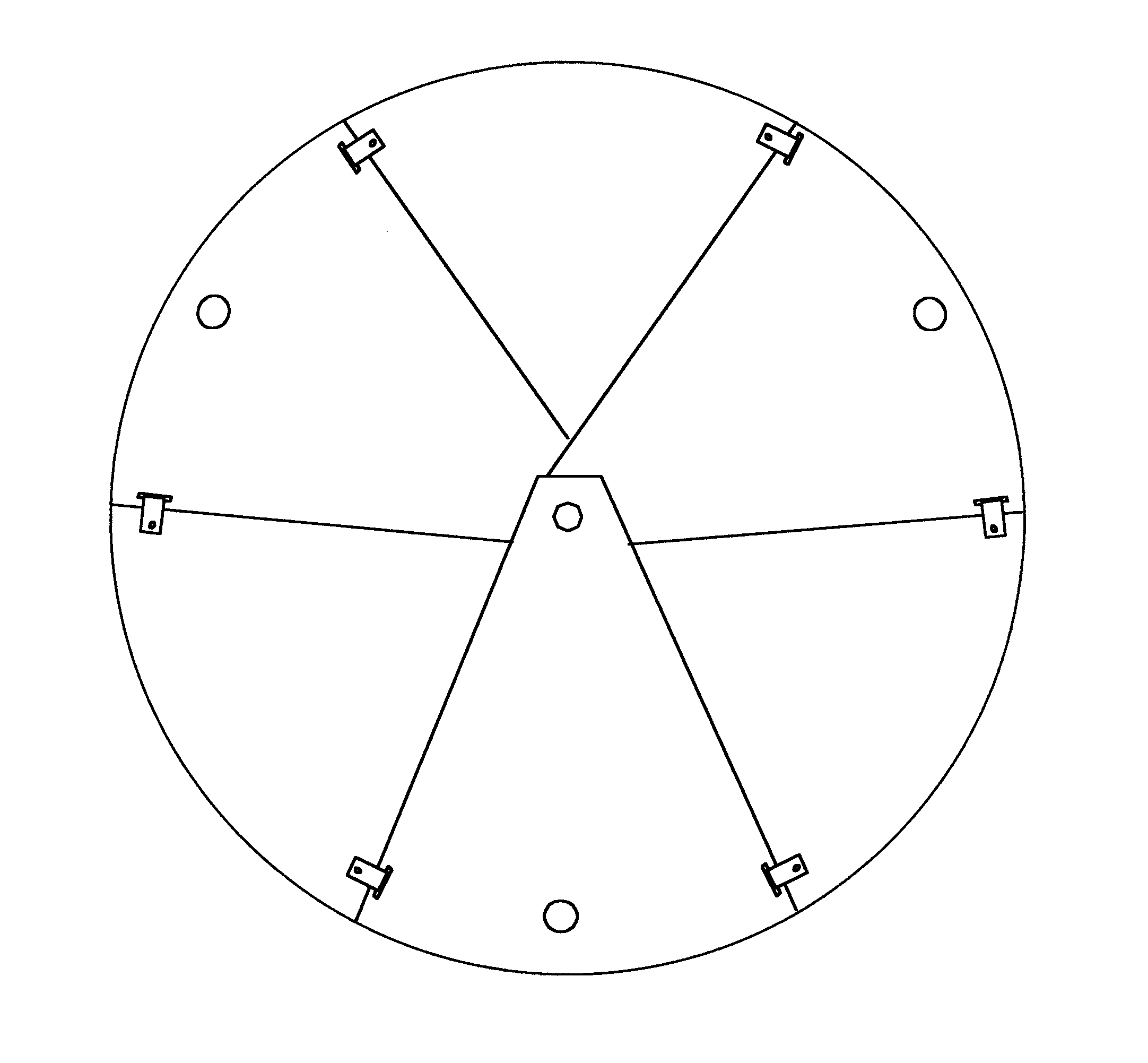 There are four basic components to the firepit: the bowl, the tripod, the cooking grill, and the coal grate. To set up the bowl, spread out the petals to form a circle, as shown at left. You will notice that half the petals have a clip on each side. The other half of the petals will have a slot on each side. Arrange the petals so that the two types alternate. Now clip the petals together by allowing the clip to fit into the slot on the adjacent petal. You will find that, to slip the last clip into the last slot, you'll have to force the two petals closer together. (You may find this easiest to do by tipping the bowl onto its side.) This tension helps keep the bowl assembled.