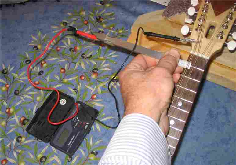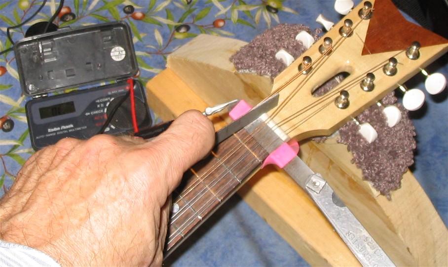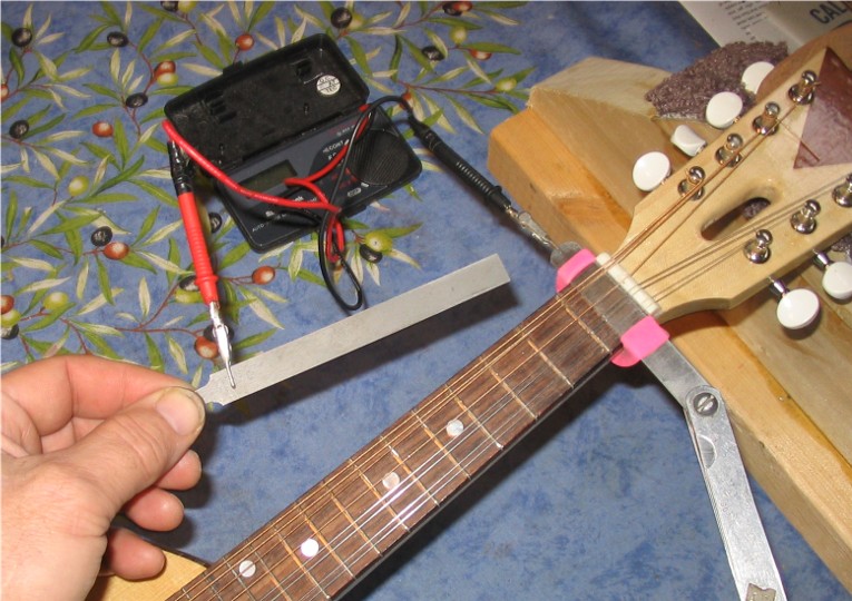When you're measuring string clearances, the tester will tell you instantly when you're at the right clearance. I've been using a Starrett taper gauge to measure these tolerances, but any feeler gauge will work the same way. You clip one lead of the tester to the gauge, and the other end to the string (or any other string, because they're all connected via the tailpiece. When you slip the gauge under the string while pressing it against the fret, the tone will sound exactly when the gauge touches both the string and the fret. Perhaps you find that if you gently rock the gauge over the fret, you can make the tone go away. That tells you that the gauge wasn't perfectly parallel to the string. You've got an accurate measurement at the exact point where you can no longer make the tone go away when you rock the gauge over the fret.