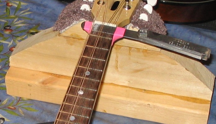 Figure one shows the combination of feeler gauges slipped under the strings at the nut, and held in place with a stout rubber band. The rubber band in the picture is what comes with the broccoli we buy at the supermarket, but feel free to substitute your own. The important thing is to make sure that the feeler-gauge stack is pressed tightly against the nut.