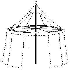 The frame provided with your DRAGONWING pavilion is a semi-rigid structure designed to keep the tent up in all but the greatest storms, with a minimum of structure and transportation problems. The result of years of continuous refinement, it can be set up by one person in much less than an hour (even in winds), is lighter and easier to transport than those of other manufacturers, and is extremely stable in winds. It consists of a center pole, a ring. made of steel tubing, to define the shape of bottom of the tent's canopy, and a system of ropes that tether the hoop to the center pole, keeping the entire structure stable in winds.