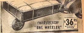 A single wheel trailer appeared in the Sears 1939 Spring catalog, evidently its debut there. This model was called the "Cross Country," a brand name it shared with a two-wheel trailer shown on the same page. It appears to have been in production only a year and a half. The catalog described it as having "Live Rubber Spring" suspension, touted as being longer lasting than metal coil springs. Its tongue arrangement was totally different from all later models, being straight pieces of metal sticking out of the front of the chassis and connected to the bumper by means of ball-and-socket couplings. (Extension arms could be bought if you needed more clearance between the car and the trailer.) The trailer, rated at 750 pounds of cargo capacity, sold for $36.95. It was made in Niles, Ohio unlike the "Cross Country" two-wheeled trailer which was made in Connorsville, Indiana.