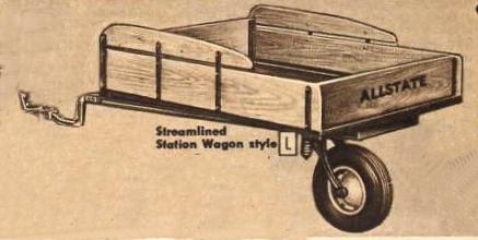 The Fall 1940 catalog showed a different trailer, with a "Knee action spring" (using a true coil-spring suspension) and the tongues that would become associated with Allstate trailers. These tongues were castings shaped into a sort of "question mark" shape and were designed to fit over a car's bumper and attach to either the bumper brackets or the car's frame. The box was 48" x 42" x 9-3/4", and appears to have been made of wood with "steel corner angles and four steel cross members," according to the catalog copy, but evidently not with the removable tailgate of the "Cross Country. It was rated for 500 pounds of cargo. This trailer came from a "factory in Chicago" and sold for $29.95 The earlier "Cross Country" trailer, with its 750 pound load capacity, was still available, with its Niles, Ohio source, and was priced at $37.95. The chassis-only option was still offered; its price was $34.50.