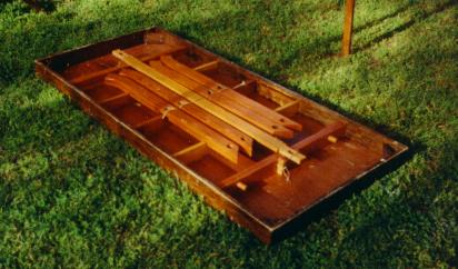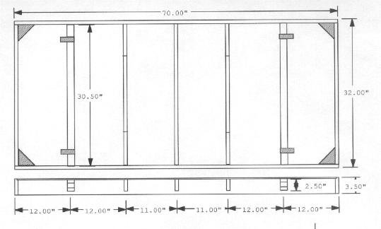 Now slip the stringers into the frame. Orient the leg attachment stringer so that the mounting pegs are facing toward the ends of the table and are as far from the tabletop plywood as possible ... there should be a clearance of one inch between the peg and the plywood. Orient the intermediate stringers so that the notch, if any, is facing UP, away from the plywood. Now attach the stringers to the end rails. I used the same system of "hidden screws" that I used for connecting the side and end rails.