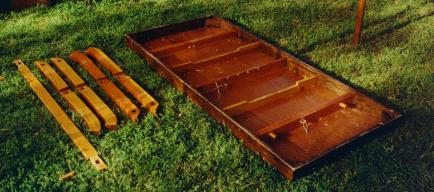 With all the stringers pre-assembled, now is the time to put the tabletop together. put a blanket down on the ground to protect the wood pieces, and lay the tabletop plywood down on it, face down. put the side rails into position around the top so that the edges of the top fit into the rabbets. Fasten the corners together with your fastener of choice. (I used screws, recessing the heads into the side rails and covering them with bits of dowel to make it appear as though the dowels themselves were doing all the holding.) Install the hardwood triangles or corner brackets to stabilize this assembly.
