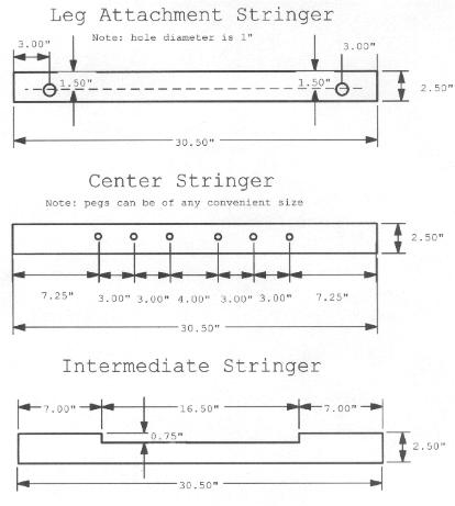 Now make the stringers, using the plans below. When you make the leg attachment stringer, cut your 1" dowel into four pieces and mount them into the holes in the stringer so that one end is flush with (or even a little recessed into) the face of the stringer. Now drill a pilot hole to accept a nail or screw that you'll drive through the top of the stringer into the peg, locking it in place. The top of he fastener should be flush with, or recessed into, the top of the stringer so it won't poke out.
