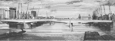 Until 1750, the London Bridge was the only river crossing in London. But once the Westminster Bridge was completed in that year, the old bridge came to be regarded as an unsightly derelict from medieval times and ripe for rebuilding. Its buildings had gone to seed, its location no longer desirable now that piped water became available elsewhere (due in large part to those water-pumps installed back in 1592). It was clear that the buildings had to go, the road widened, and the waterway improved. All this was completed by 1763, under the direction of the Swiss-French engineer Charles Labelye. For the first time since the bridge had been built over 500 years before, a Londoner could look out on a bridge unimpeded by any edifices. Most of the upper stonework had been replaced, and the piers greatly expanded to carry the added roadway. And one of the piers near the bridge's center was entirely removed and its two adjacent arches replaced by a larger single arch.