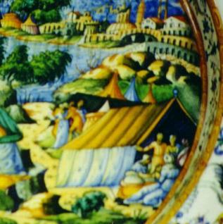 And so the situation remained until this summer, when my brother Joe (known in the SCA as Master Joseph de la Tour) was in a museum in Florence, Italy, looking at some tableware from the sixteenth century. One of the painted plates caught his eye in particular, since he knew I was a sucker for tent pictures, and he took a picture of that plate.