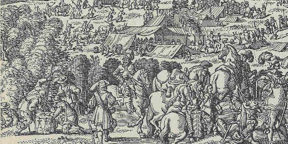 It's an engraving from Strada's "De Bello Belgico" (1651 Edition). Note the date, because that puts the picture out of our period of study.The question is: was the engraver working from another sketch, made after the battle, or was he drawing what he figured an encampment of that period would look like? We don't know, and therefore this engraving can't be considered documentation for the kind of tent we see around the SCA. At most, it can be said that the artist would have considered that sort of tent appropriate to that particular era.