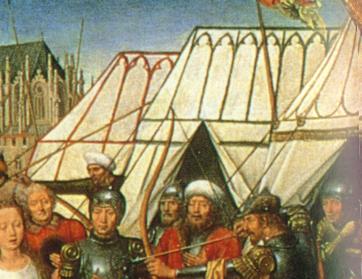 The picture reproduced above is a detail of Hans Memlinc's Shrine of Saint Ursula, consecrated in 1489. (The piece itself is in the Memlinc Museum, St. John's Hospital, Bruges.) I'm using it here to illustrate some of the joys and pitfalls of doing research based on period representations.