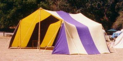 Back in the mists of time, Duke Frederick of Holland (known outside the SCA as Dr. Frederick Hollander of the University of California at Berkeley, and as "Flieg" to people in both communities) decided he needed a large sunshade. He sewed three wide pieces of cloth together to make a piece about fifteen feet wide and forty feet long or so, and set the fabric up on a frame consisting of longer center poles and shorter side poles, with the ends staked down. The result was a shape that stood up well in winds and shed rain adequately. (The original version was much lower and wider than the ones currently in use. Somebody remarked that, at a distance, it looked like a Klingon Battle Cruiser, and from that day to this its nickname has been the "BC.") The picture above shows such a sunshade.