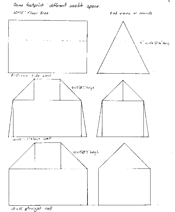Frame styles that rely mainly on perimeter poles with center poles tend to use less poles in the moderate sizes, thereby giving you more usable packing space. The larger sizes tend to use at lot of poles. They rely heavily on stakes and tension lines. Also, as your fabric stretches, the poles will be able to accommodate that and maintain a uniform looking tension on your pavilion. Remember -- the more poles there are, the more stakes you will need to pound and the more time your tent will take to assemble. One advantage is that the poles are easy to make. Get a wooden pole (2x2 or dowel) and stick a nail in the end, not elegant, but functional. Even better would be drilling a hole in the end and using a 6-8 inch piece of 1/4 inch steel rod that can be removed for packing and transportation, longer if you want to put a flag on the end of it.
