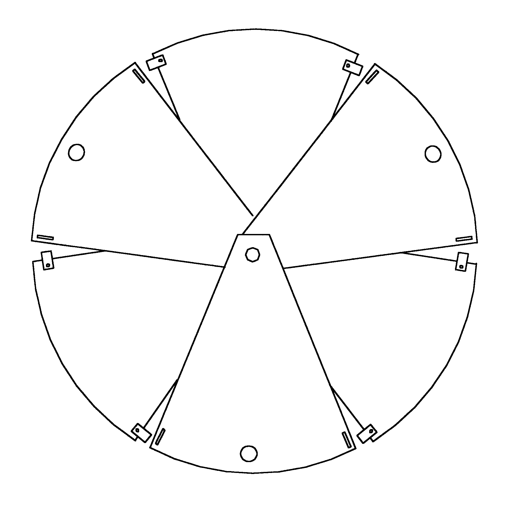 There are four basic components to the firepit: the bowl, the tripod, the cooking grill, and the coal grate. To set up the bowl, spread out the petals to form a circle, as shown at left. You will notice that half the petals have a clip on each side. The other half of the petals will have a slot on each side. Arrange the petals so that the two types alternate. Now clip the petals together by allowing the clip to fit into the slot on the adjacent petal. You will find that, to slip the last clip into the last slot, you'll have to force the two petals closer together. (You may find this easiest to do by tipping the bowl onto its side.) This tension helps keep the bowl assembled.