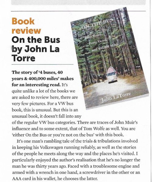 "John LaTorre offers a significant new book for the canon of writings on classic Volkswagen vehicles -- his love of the VW bus. What's remarkable about Mr. LaTorre's account is not only his historical insights but also most importantly his anecdotal reveal of his intimacy with the bus, from his meandering campout adventures on the road to his rewarding yet greasy work in keeping his buses alive.