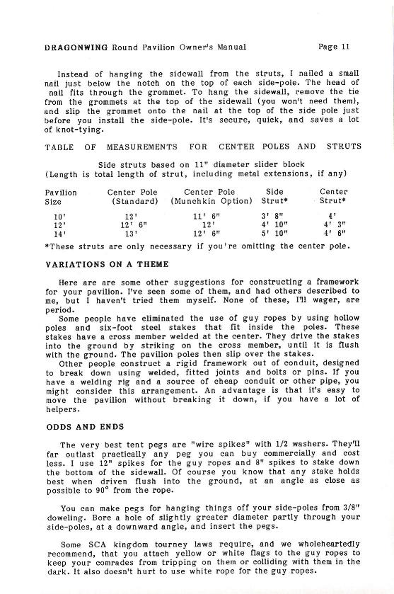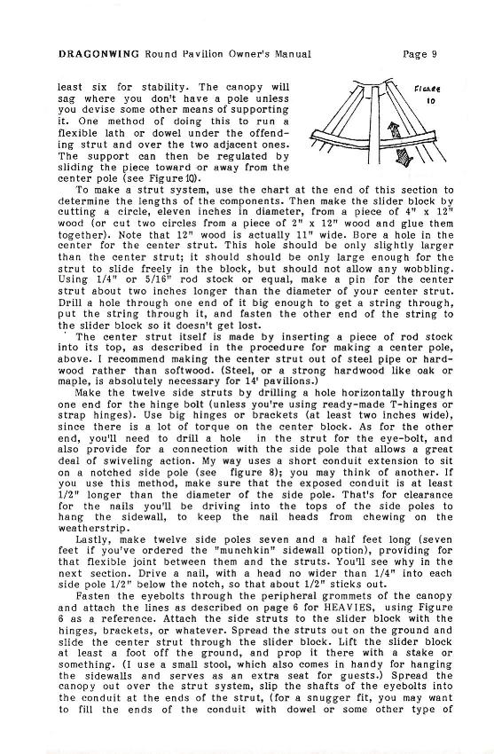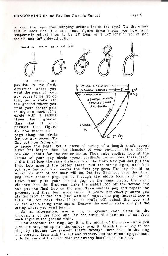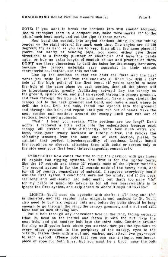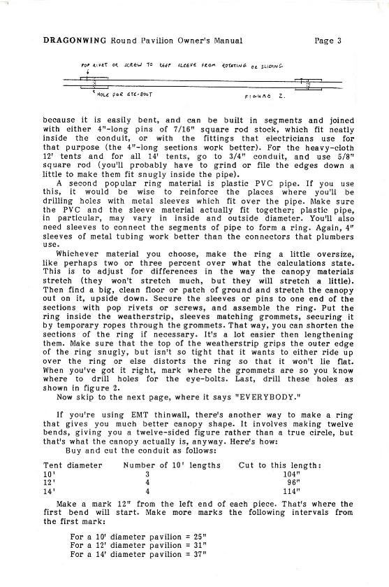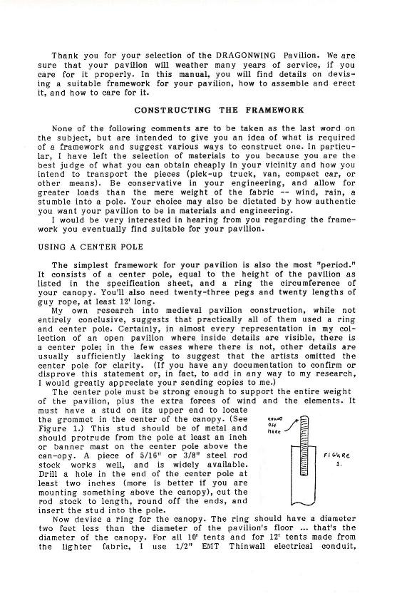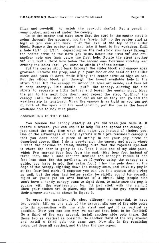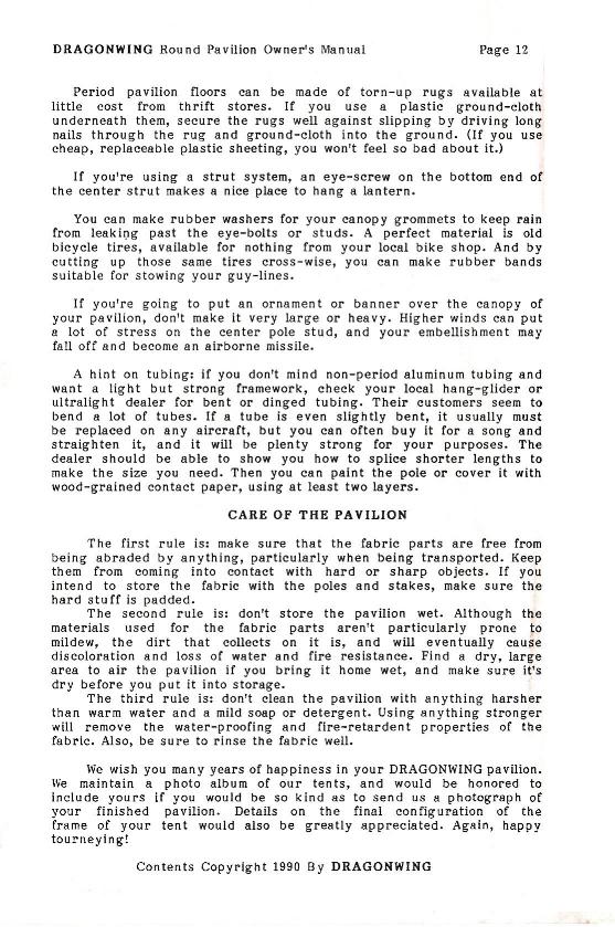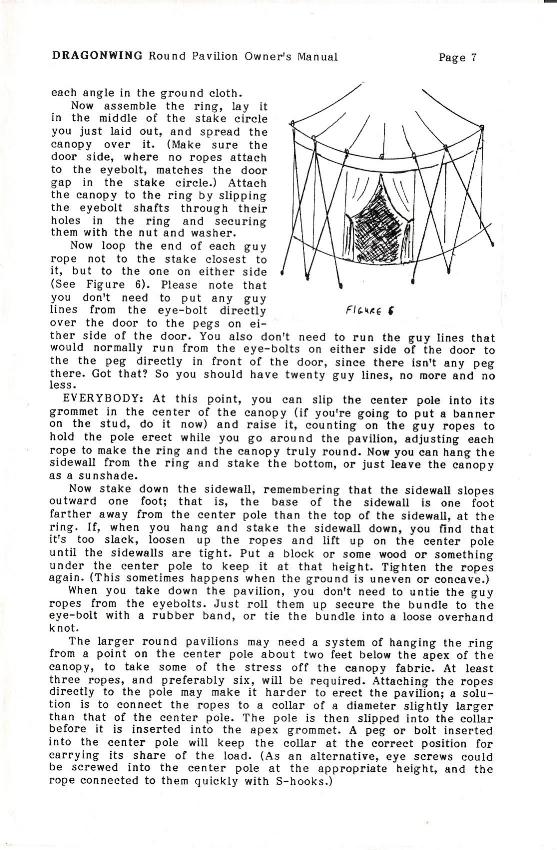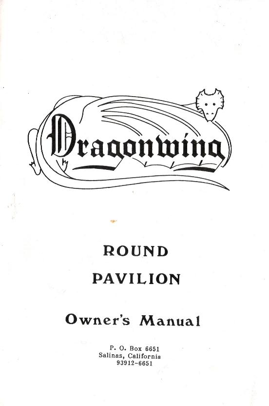 This is the owner's manual for one of the first pavilions Dragonwing made. It was produced from 1987 to 1991, in a "fabric only" configuration. The manual is included on this web site mostly for historical reasons, although I made a few of them and I'm confident that at least some of them (particularly the ones made of Pyrotone or Fyrecoat) are still functional.