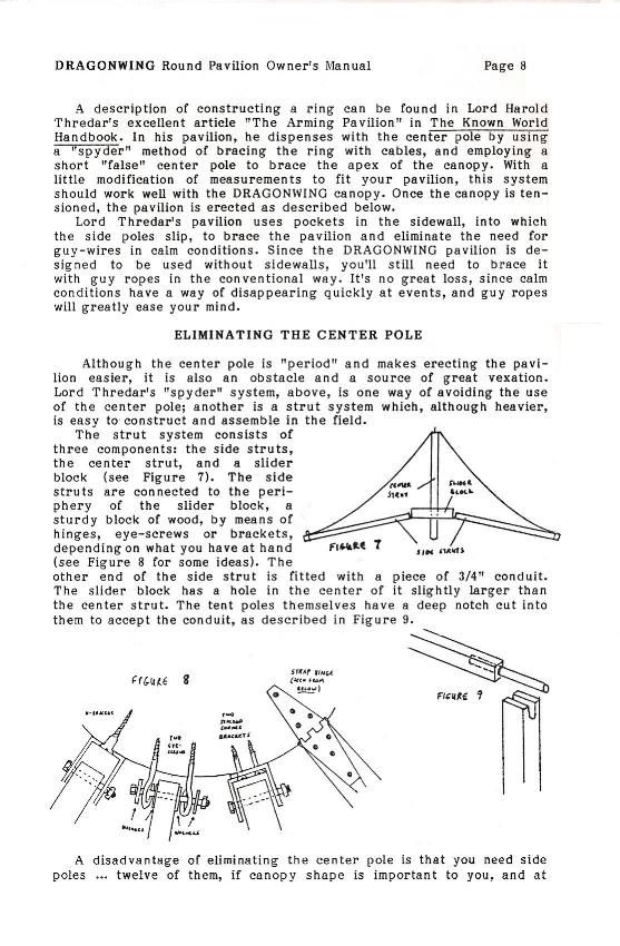 The description of the frame may be of interest to those who are looking for ways to eliminate the center pole from their tents. The "strut frame" was very workable, but it was heavy, so all my own tents that were equipped with this frame were later retrofitted to a center pole and ring system. This strut system can be described as an early version of what is now called a hub-and-spoke system. That system, which was refined by Past Tents in England and now used by many manufacturers, appears to have been developed totally independently from the Dragonwing strut system.